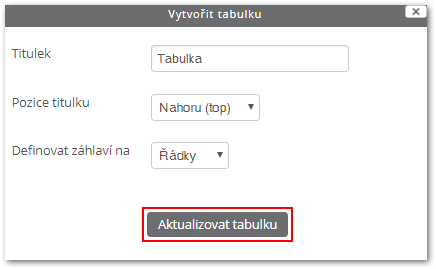 Zvolíte-li možnost Upravit tabulku (viz obr. 4), můžete upravit titulek a jeho pozici nebo definovat záhlaví. Vše uložíte kliknutím na tlačítko “Aktualizovat tabulku”.